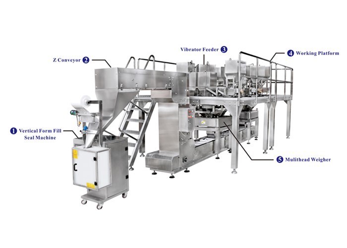 O sistema que inclui um alimentador do vibrador, transporte da cubeta de Z, plataforma de funcionamento, pesador de Multihead, máquina vertical do selo da suficiência do formulário, transporte dos produto acabados, detector de metais do conta-gotas. A máquina de embalagem de mistura totalmente automático do saco do pesador é para produtos dos petiscos, do cereal, do café, do chá, do arroz, das porcas, dos doces, os granulados, e do pó em um descanso ou em um saco gusseted. Pode ser integrada com vários enchimentos para cumprir as finalidades de empacotamento diferentes, variando dos pesadores da combinação da multi-cabeça.